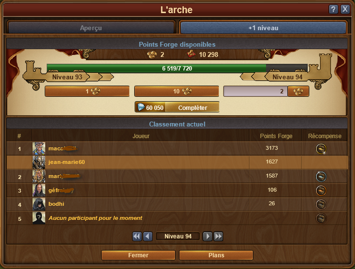 Sans l'Arche, vous auriez gagné 165 pf, 4177 médailles et 4 plans.