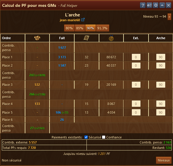 La ligne "Contri. perso" en vert cela indiquent au propriétaire de l'arche ce qu'il doit encore mettre ici 243 pour sécuriser la place 3, ensuite quant la place 3 sera prise il ajoutera 266 pour sécuriser la place 4 qui est à 133 PF la place 5 a déjà été prise dans ce cas.